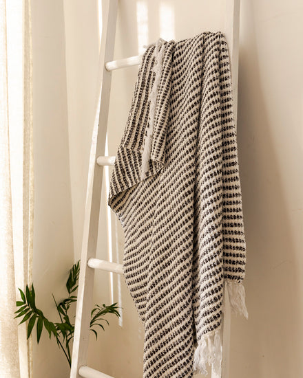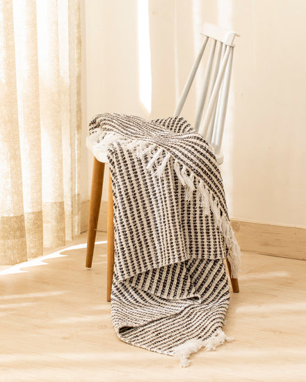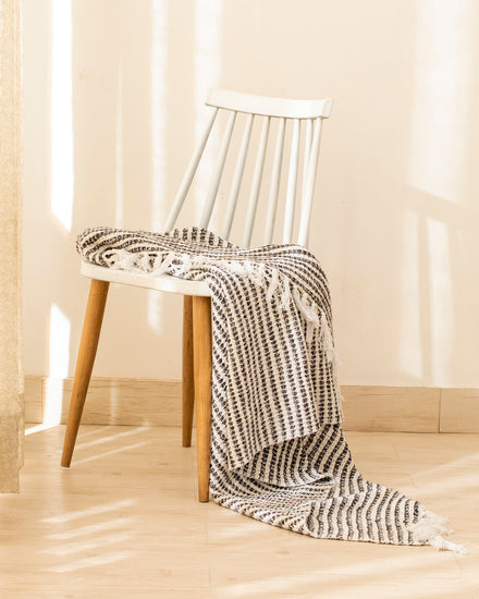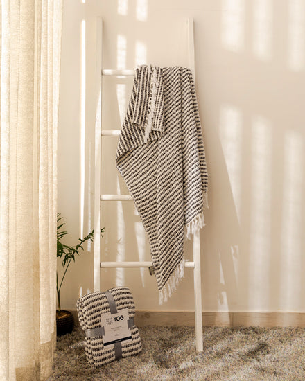 Our sophisticated throw that adds a touch of modern flair to your living space. This exquisite throw features a classic white base adorned with chic black spots, creating a timeless pattern that exudes style and versatility.Elegance goes beyond the ordinary with meticulously designed white tassels that add an extra layer of refinement.
